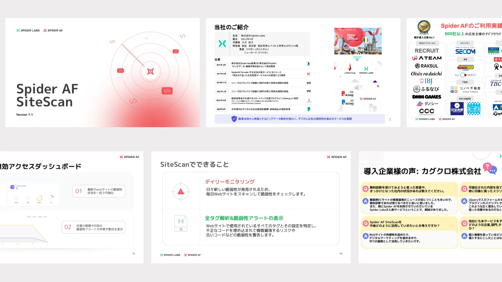 Spider AF SiteScanのサービス内容がこれ一つで分かります。webサイトのセキュリティ対策を検討されている方向けの資料です。
